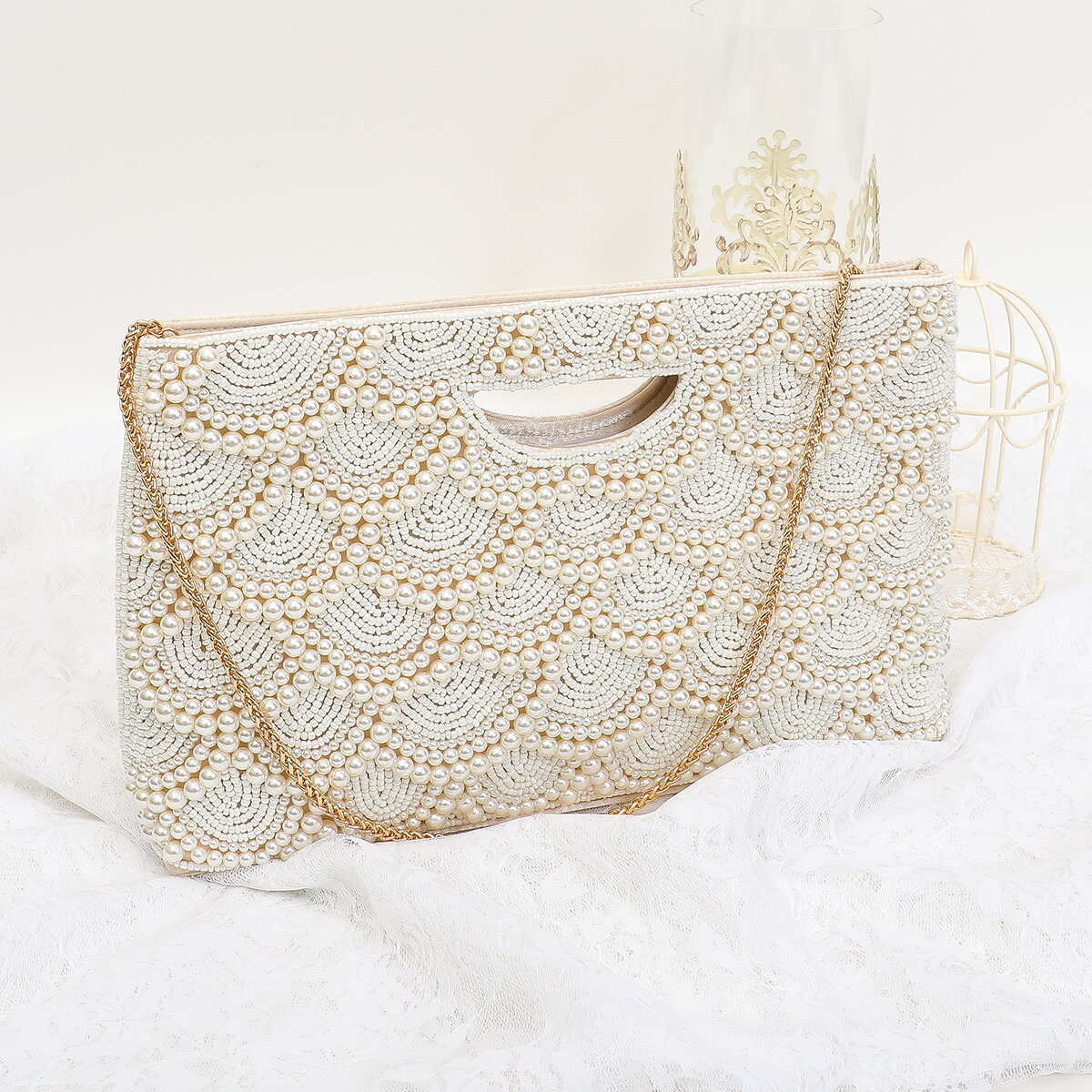 2way パール ビーズ パーティーバッグ 大きめ チェーン付き 結婚式 バッグ クラッチ ショルダー ハンド スカラップ スクエア 二次会 お呼ばれ 入学式 卒業式 ウエディング オケージョン パーティー フォーマル 上品 エレガント レディース ベージュ 送料無料 sarto